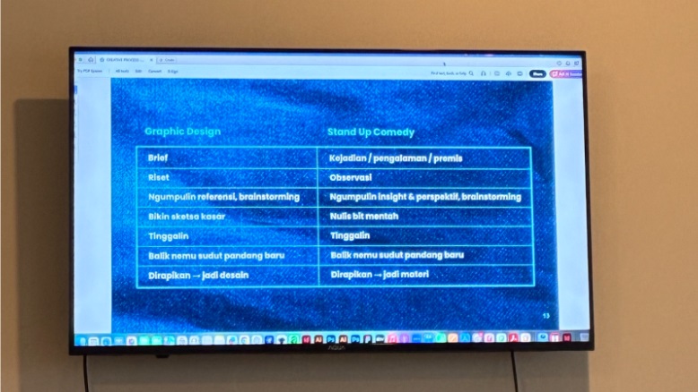 Mungkin, bagi sebagian komika masih belum menemukan titik temu antara proses kreatif seorang desainer dengan seorang stand up comedian. Robby menjawab hal itu dengan memberi proses kreatif yang tadi ia jalani, tapi versi stand up comedian.